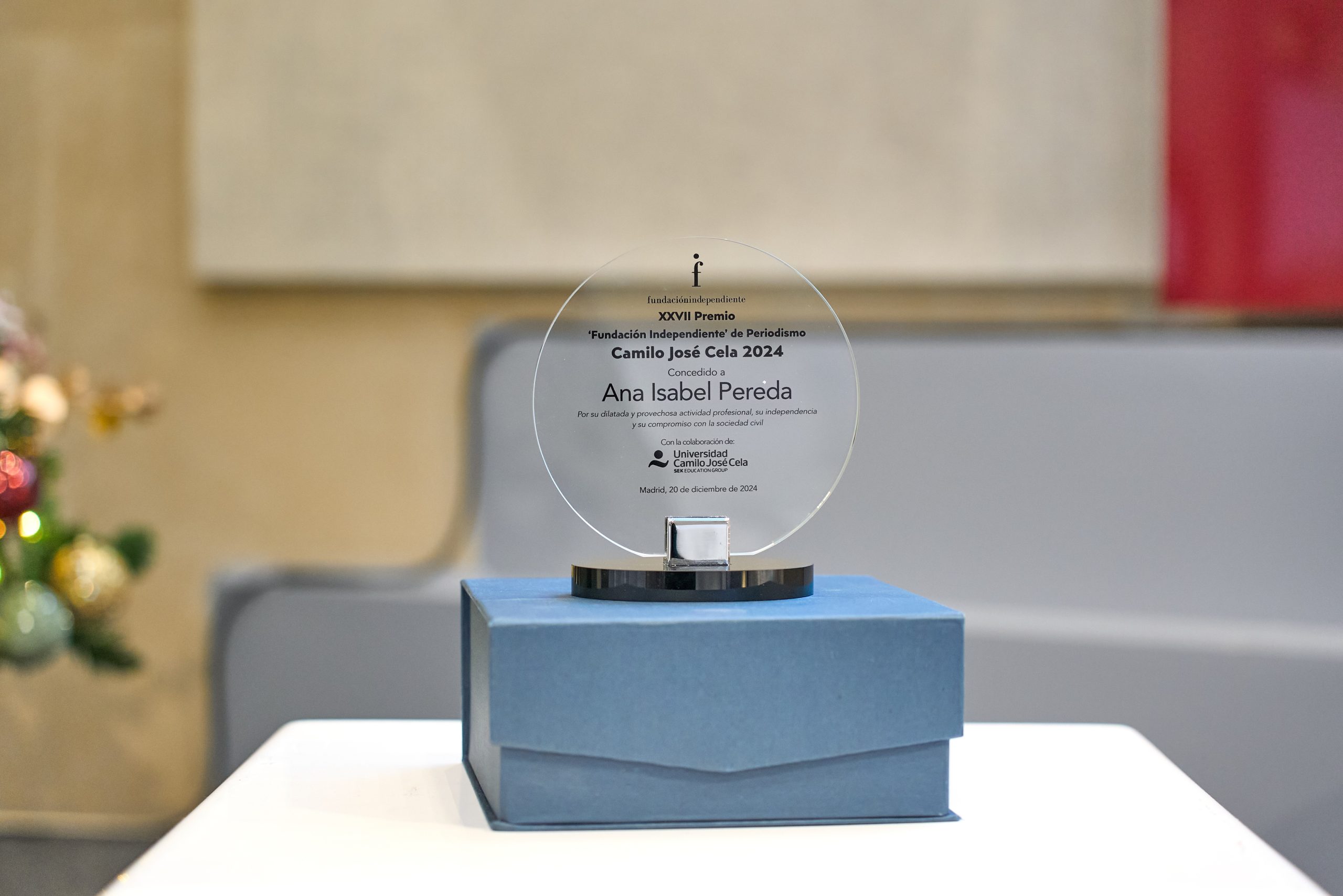 El acto de entrega del premio ha tenido lugar el 20 de diciembre, en la Universidad Camilo José Cela-Campus de Almagro. El acto estuvo presidido por Aldo Olcese, presidente de la Fundación Independiente, quien también realizó la laudatio, acompañado por Susana Reyero, directora de Comunicacion y Relaciones Institucionales de la Institución Educativa SEK- Universidad Camilo José Cela.