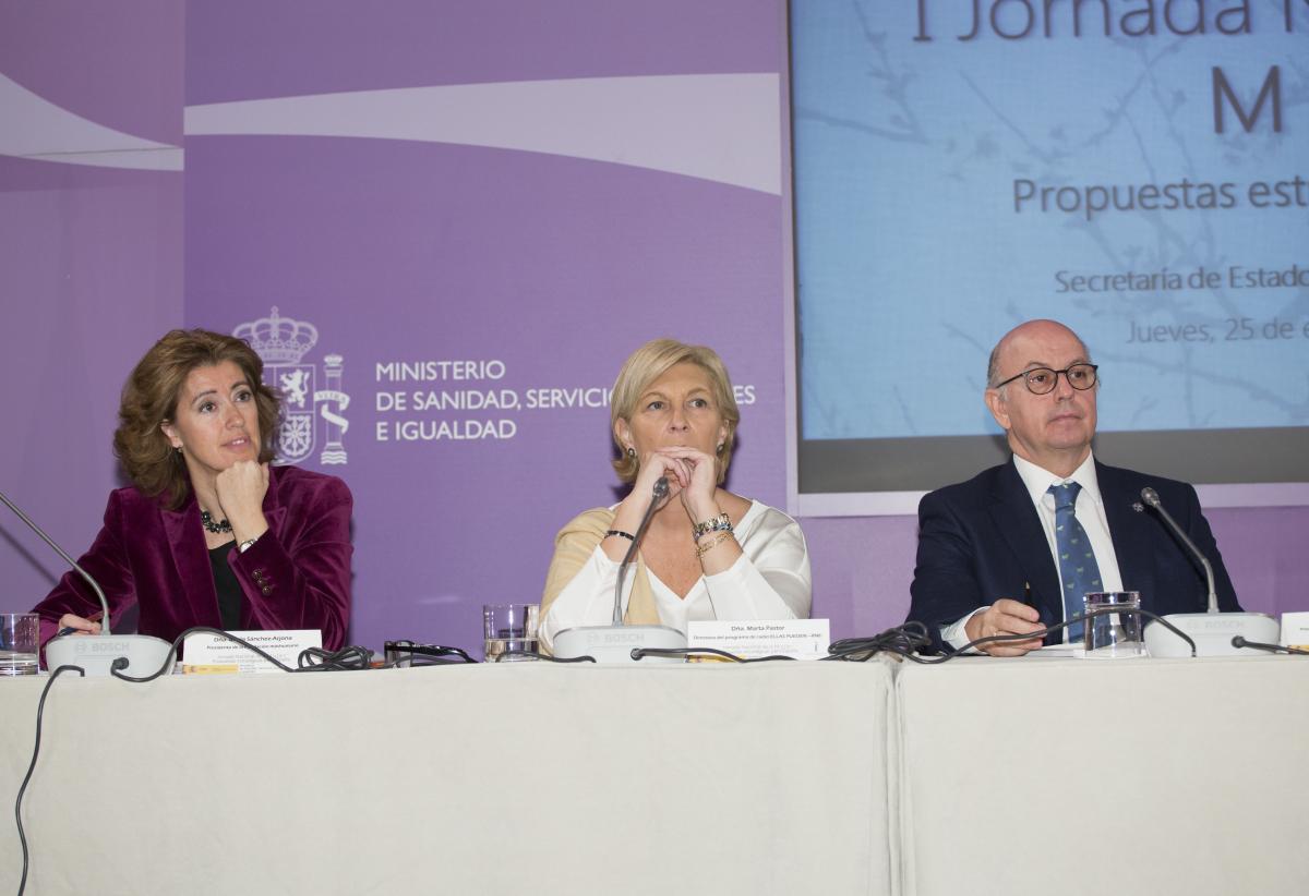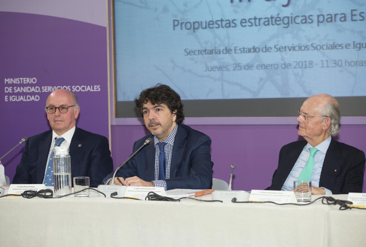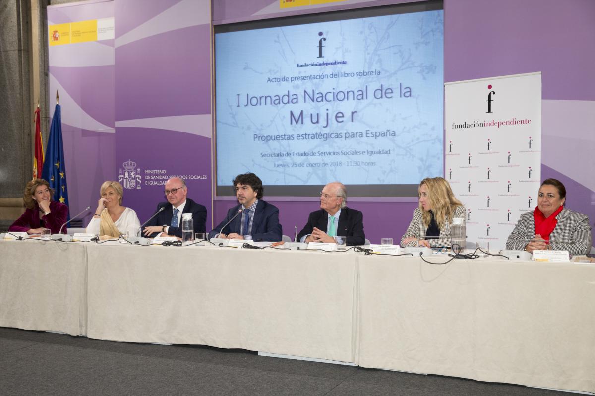 Madrid, 25 de enero de 2018.- El día 25 de enero, en la Secretaría de Estado de Servicios Sociales e Igualdad, se ha presentado el libro sobre la I Jornada Nacional de la Mujer, celebrada en mayo de 2016, y que recoge las ponencias y conclusiones desarrolladas durante la citada Jornada. Al acto asistieron el presidente del Comité Ejecutivo de la Jornada, Ignacio Buqueras y Bach; la presidenta de FEDEPE, Ana Bujaldón; la presidenta de Mujeres por el Diálogo y la Educación, Giovanna de Calderón; la periodista y directora del programa de RNE Ellas Pueden, Marta Pastor; la presidenta de la Fundación MásHumano, María Sánchez-Arjona; y el presidente de la Fundación Independiente, Aldo Olcese. El acto fue clausurado por Mario Garcés, secretario de Estado de Servicios Sociales e Igualdad.