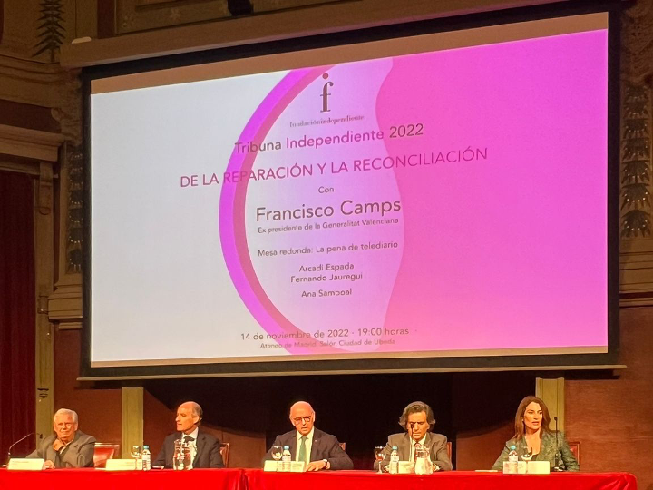 Madrid, 14 de noviembre de 2022.- Ayer, 14 de noviembre, se celebró en el Ateneo de Madrid la Tribuna Independiente titulada «De la reparación y la reconciliación» con Francisco Camps, ex presidente de la Generalitat Valenciana, absuelto por la justicia en nueve procedimientos judiciales en los últimos diez años.