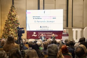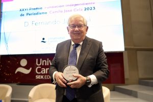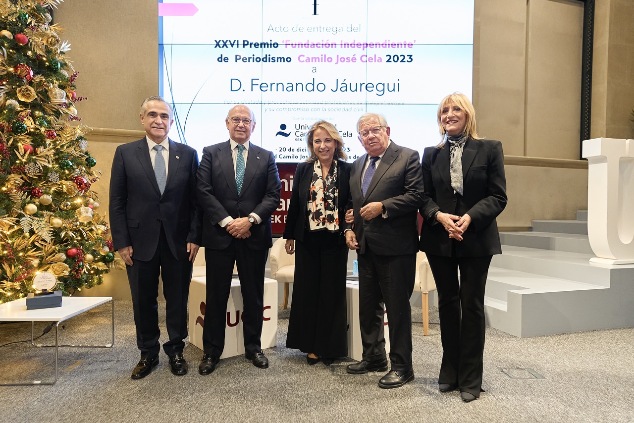 Madrid, 20 de diciembre de 2023.- Fernando Jáuregui, periodista de prensa, radio y televisión, y escritor, es el nuevo Premio ‘Fundación Independiente’ de Periodismo Camilo José Cela 2023, que otorga la mencionada institución desde hace 26 años, y este año con el patrocinio de la Universidad Camilo José Cela. El galardón reconoce la actividad profesional de Fernando Jáuregui y su compromiso con los ciudadanos. El acto de entrega del premio ha tenido lugar el 20 de diciembre, en la Universidad Camilo José Cela-Campus de Almagro. El acto estuvo presidido por Aldo Olcese, presidente de la Fundación Independiente, acompañado por Nieves Segovia, presidenta de la Institución Educativa SEK- Universidad Camilo José Cela.